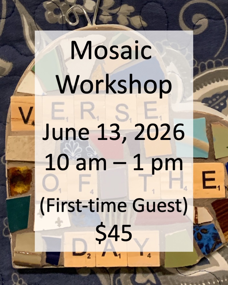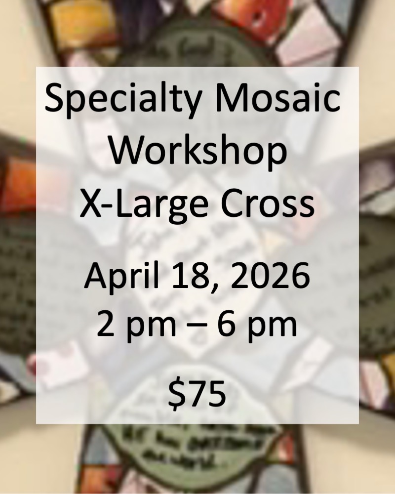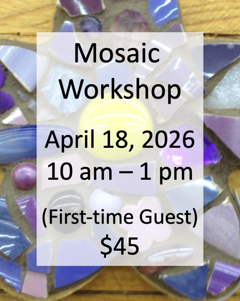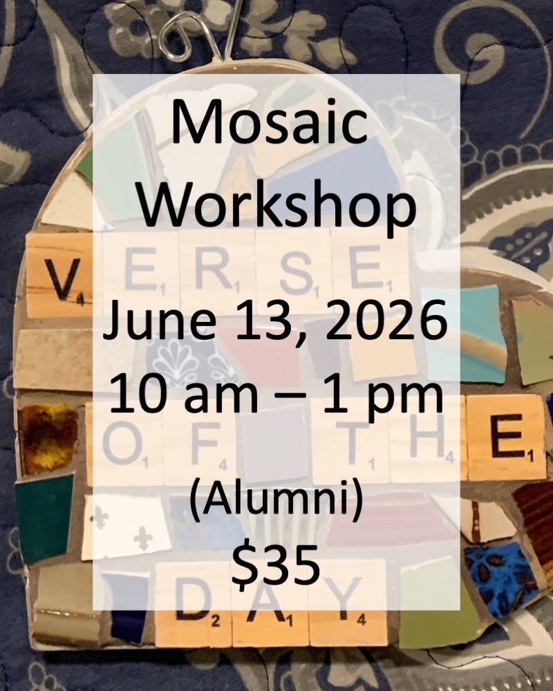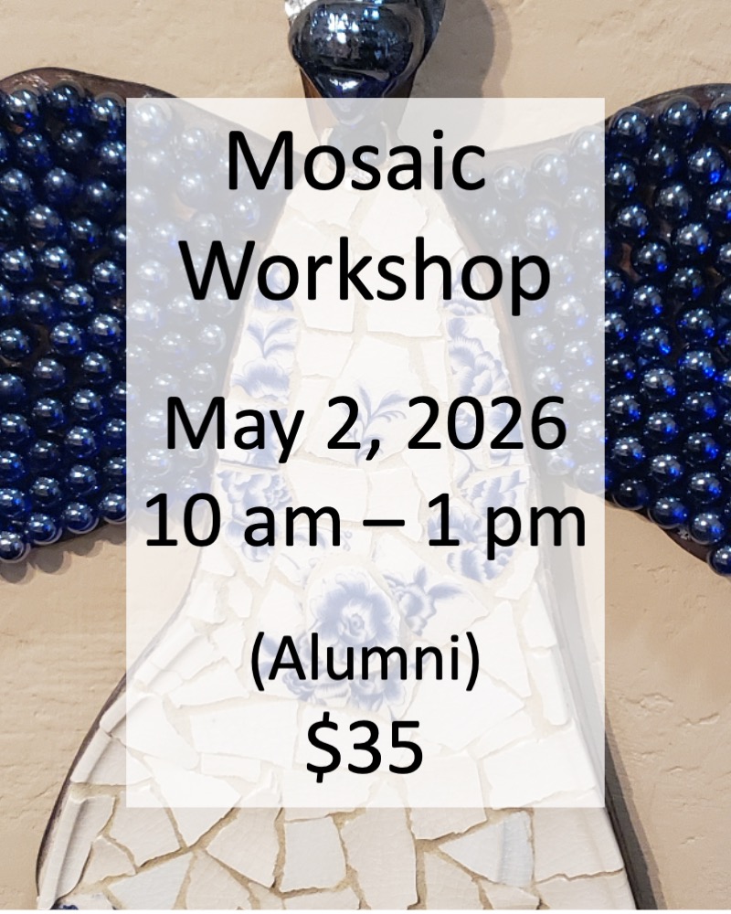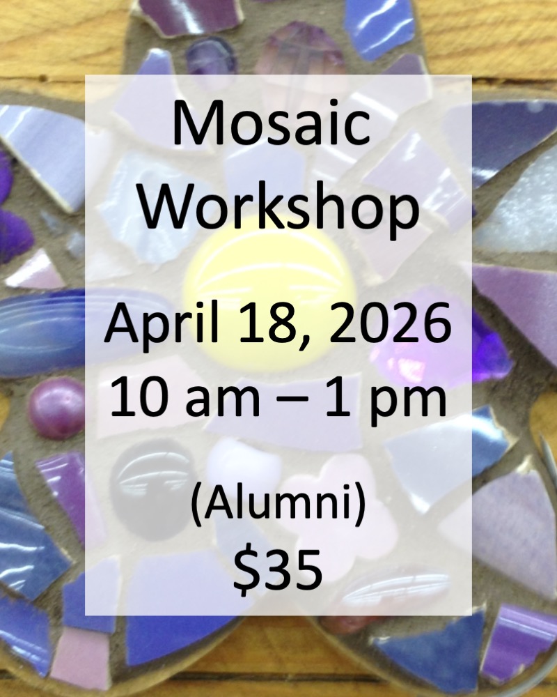 Registration is complete when payment is received. If you register as an alumni but you are a first time guest, your registration is not complete until you pay the full amount. Your registration is cancelled will be released if full payment is not received within two days after additional payment is requested, and you will receive a mosaic kit in lieu of the workshop. No refunds. Guests who give 24 hour cancellation notice can receive a mosaic kit in lieu of the workshop for guests.